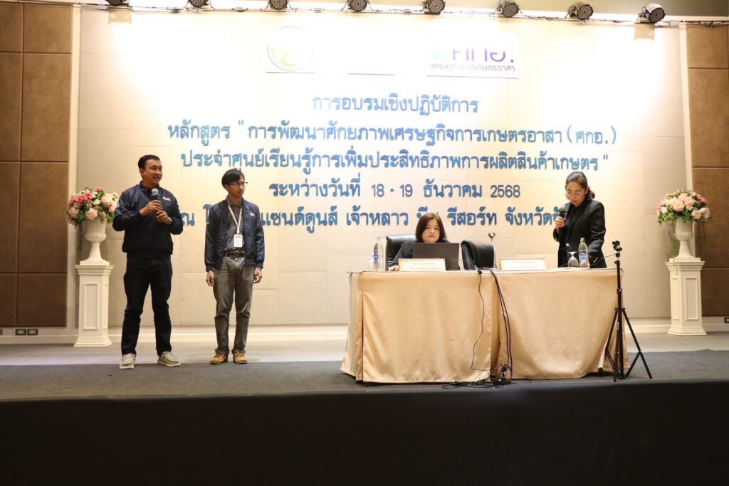 สำหรับการพัฒนาศักยภาพ ศกอ. ในครั้งนี้ ได้บูรณาการรูปแบบการเรียนรู้ทั้ง Onsite และ Online โดยเนื้อหาหลักสูตรประกอบด้วยการบรรยายสถานการณ์และแนวโน้มเศรษฐกิจการเกษตร ปี 2568 – 2569 นโยบายและมาตรการที่สำคัญด้านสินค้าเกษตร ตลอดจนการฝึกปฏิบัติ (Active Learning) ในหัวข้อสำคัญ เช่น 1. การใช้ประโยชน์แพลตฟอร์ม Big Data เกษตรระดับจังหวัด “AgriDataProv” 2. การทดลองรายงานราคาสินค้าเกษตรรายสัปดาห์ ผ่านแอปพลิเคชัน”ราคาฟาร์ม” (Farm Price) แบบ Real-time 3. การรายงานภาวะการผลิตสินค้าเกษตรรายเดือน ผ่าน Google Form ตามระเบียบวิธีการสำรวจปริมาณการผลิตพืช และ 4. การคำนวณต้นทุนการผลิตพืช และการสร้างการรับรู้สถานการณ์ด้านการตลาดที่รวดเร็วเพื่อนำไปปรับใช้และถ่ายทอดสู่เครือข่ายชุมชนต่อไป
