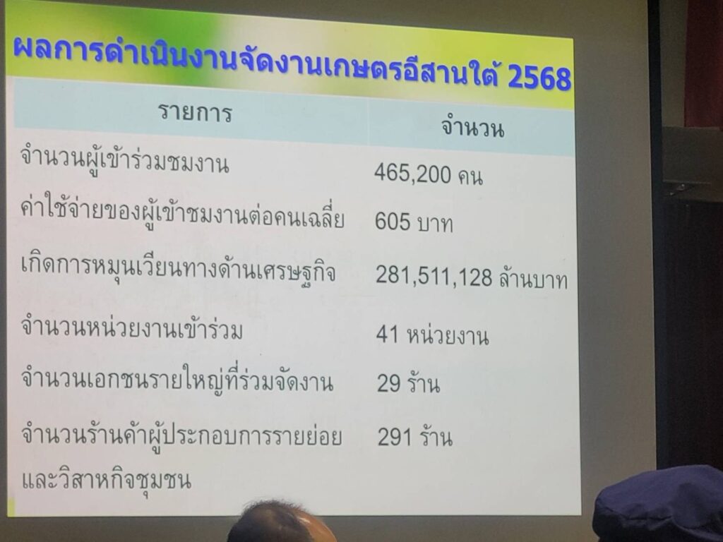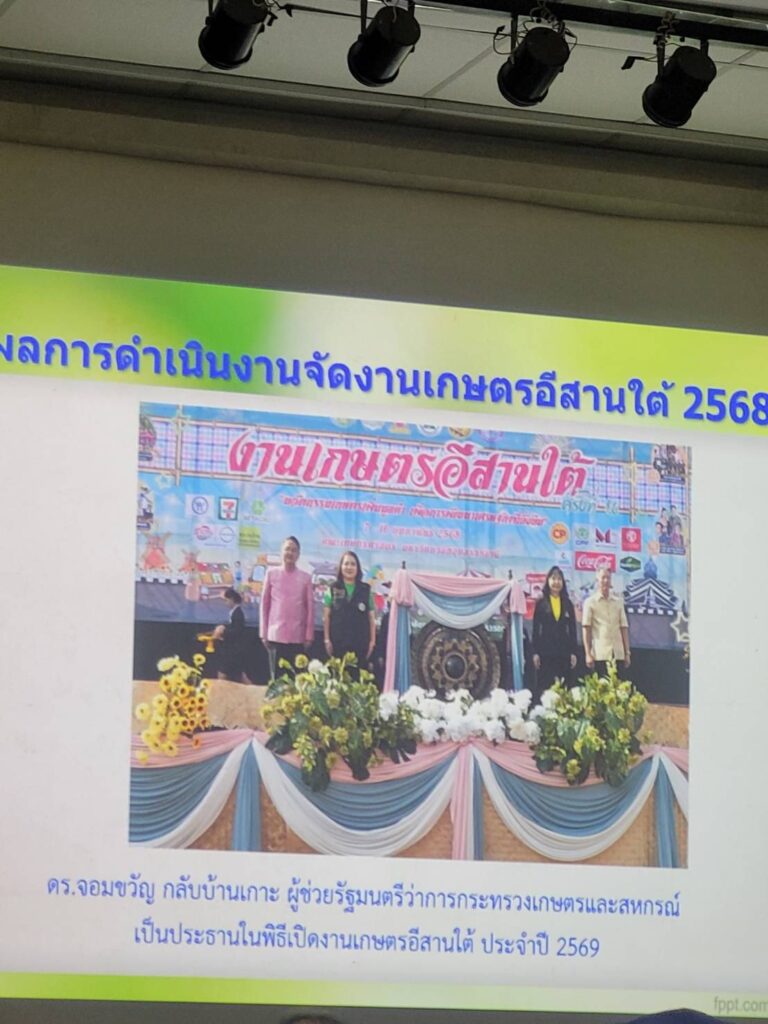ในโอกาสนี้ สำนักงานเศรษฐกิจการเกษตรที่ 11 ได้นำเสนอผลการจัดนิทรรศการงานเกษตรอีสานใต้ ประจำปี 2568 และ มีแผนการจัดนิทรรศการงานเกษตรอีสานใต้ ประจำปี 2569 ภายใต้หัวข้อ AgriDataProv แพลตฟอร์ม Big Data ภาคเกษตรเพื่อการบริหารจังหวัด